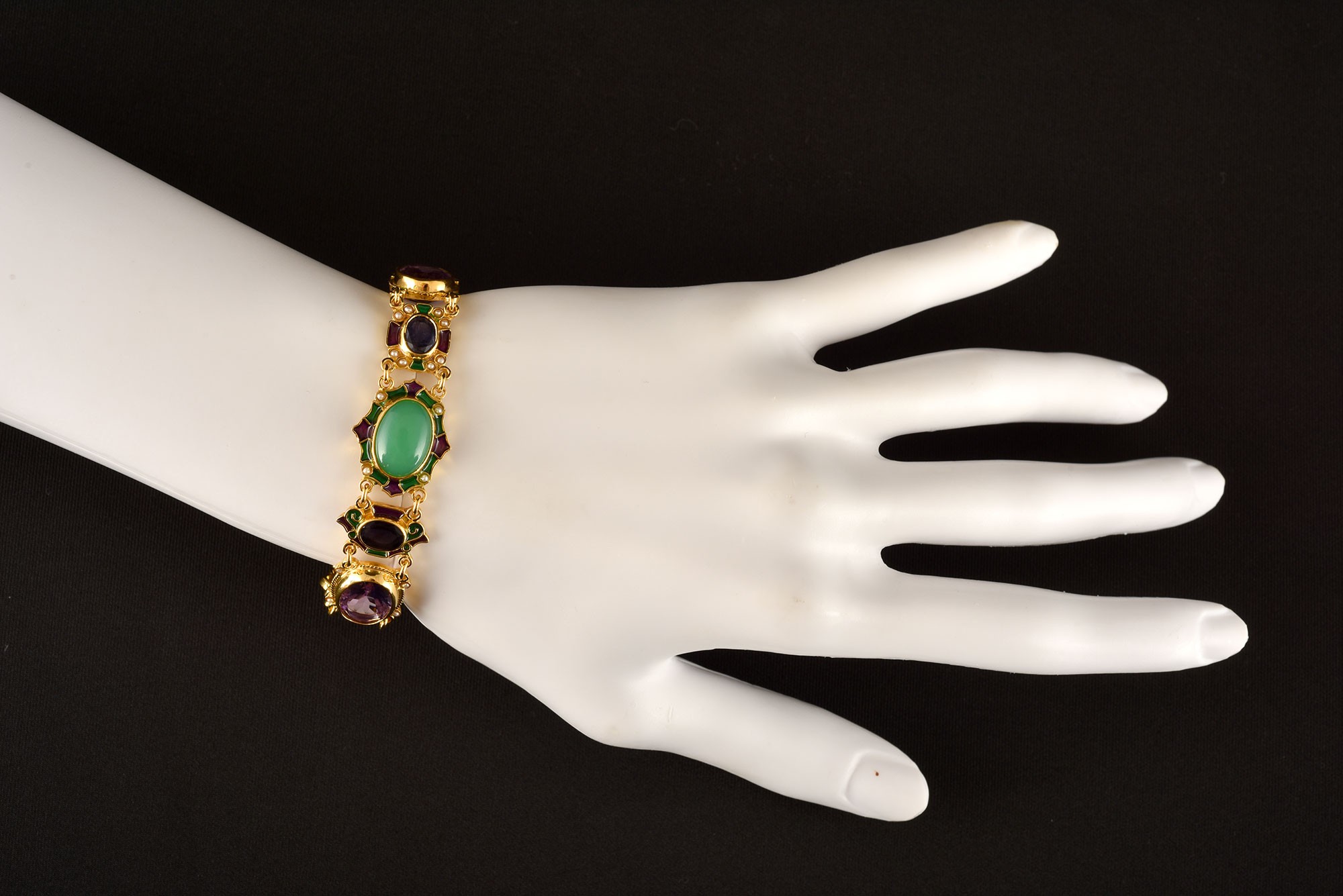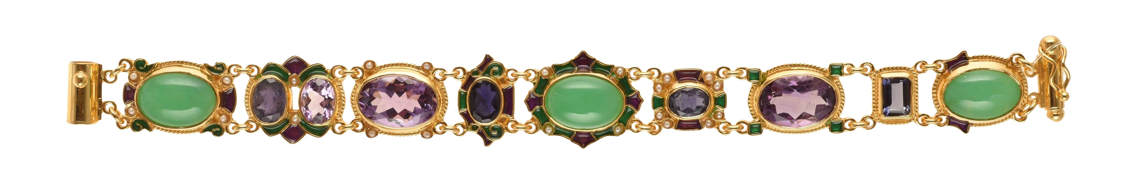 Made with enamel in cloisonné technique, with chrysophrase, amethyst, iolite, natural micropearls.