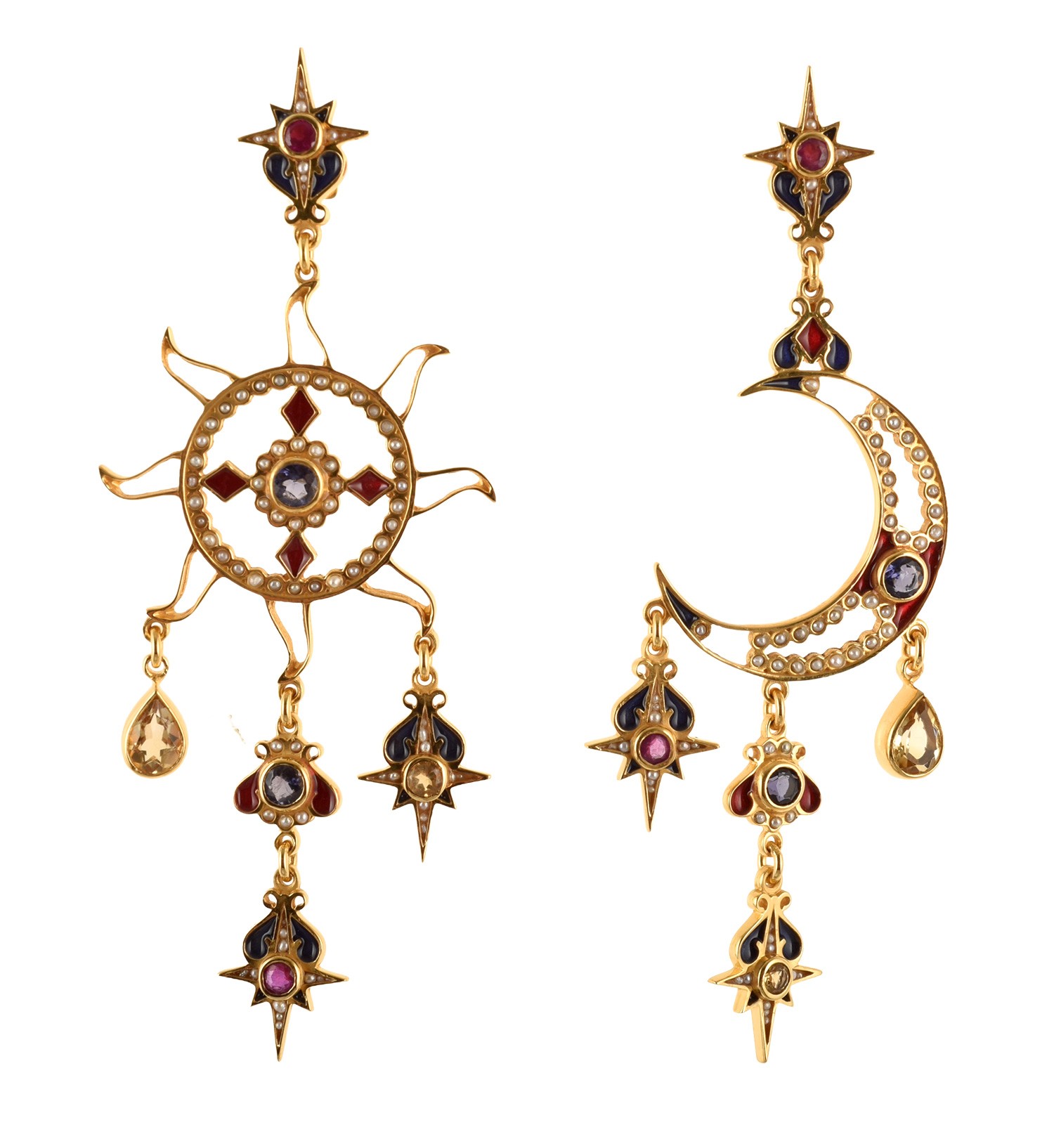 Made with enamel in cloisonné technique, with tanzanite, ruby, citrine, natural micropearls.