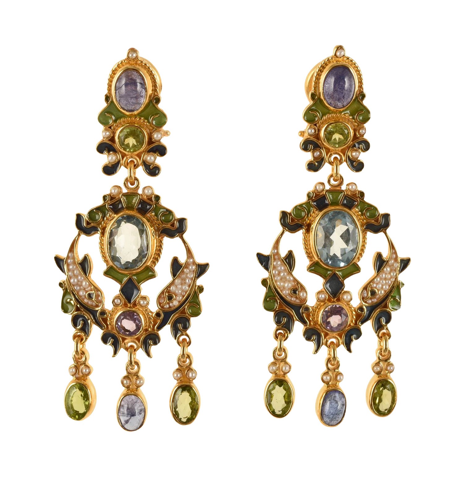 Made with enamel in cloisonné technique, with blue topaz, tanzanite, amethyst, peridot, natural micropearls.