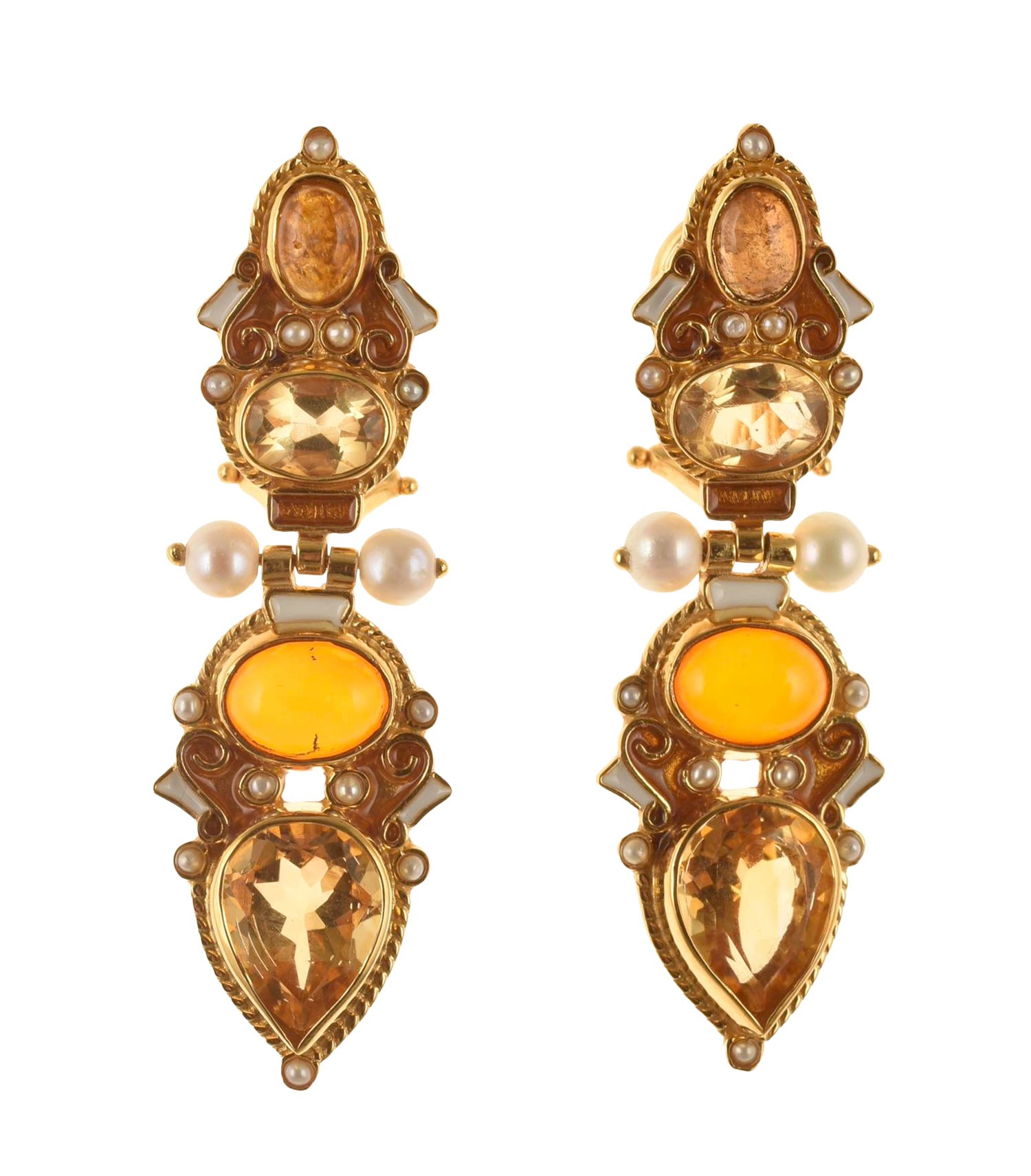 Made with enamel in cloisonné technique, with citrine, amber, yellow, tourmaline, pearls, natural micropearls.