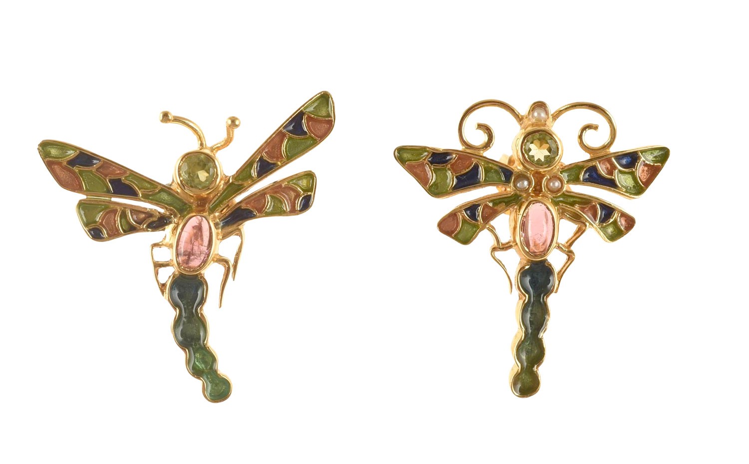 Made with enamel in cloisonné technique, with peridot, tourmaline, natural micropearls.