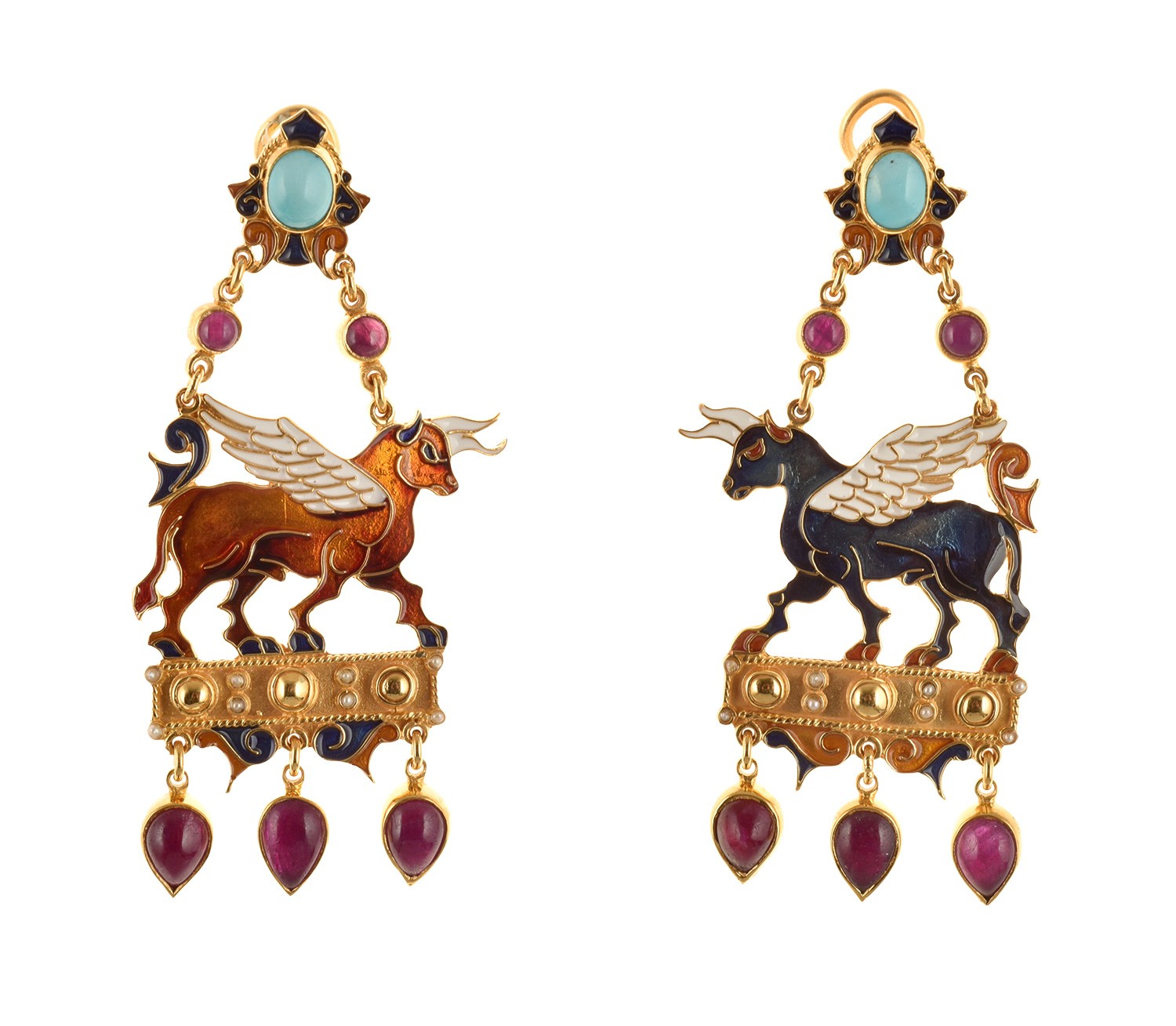 Made with enamel in cloisonné technique, with ruby, turquoise, natural micropearls.