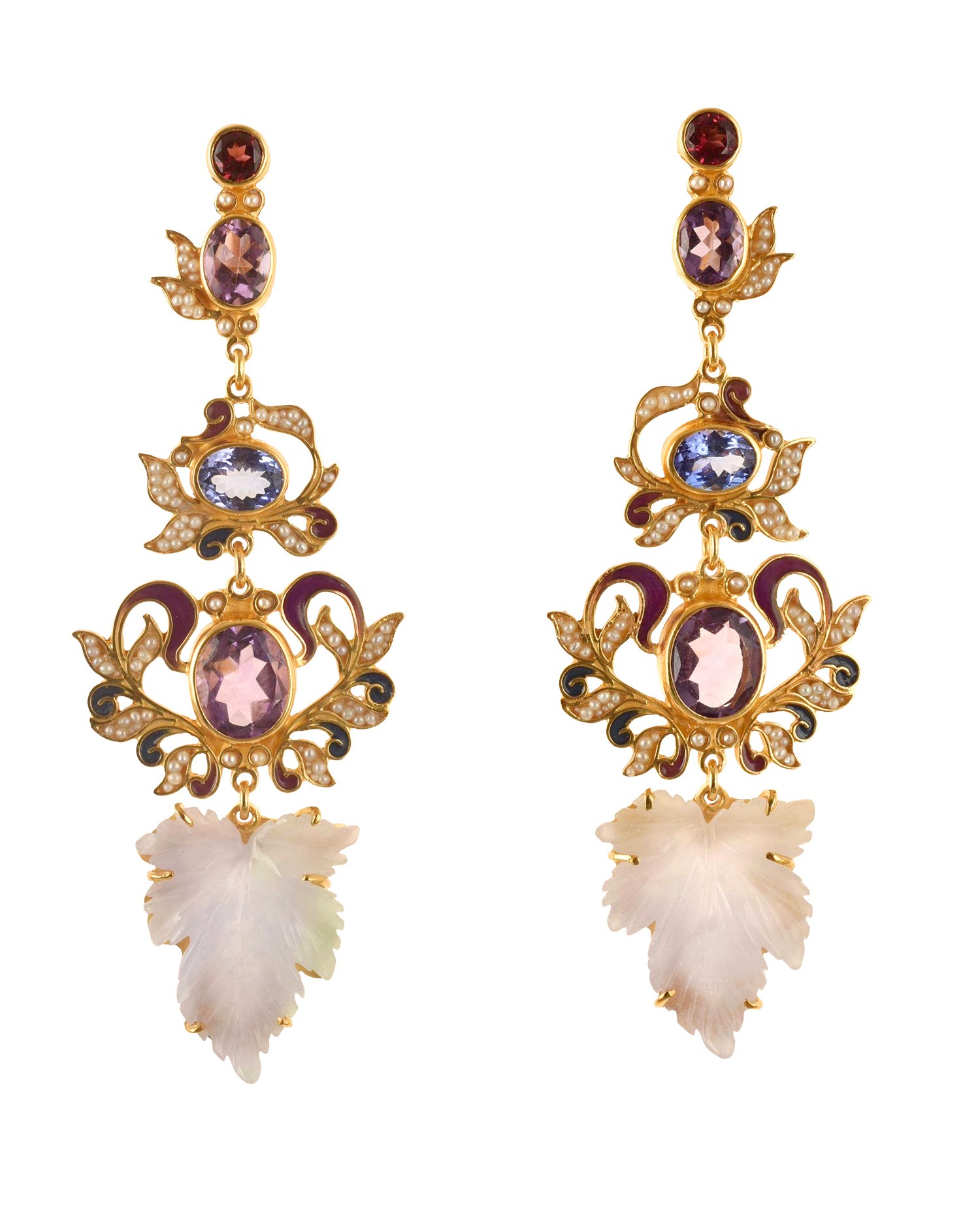 Made with enamel in cloisonné technique, imperial jade engraved leaves, amethyst, tanzanite, rhodolite, natural micropearls.