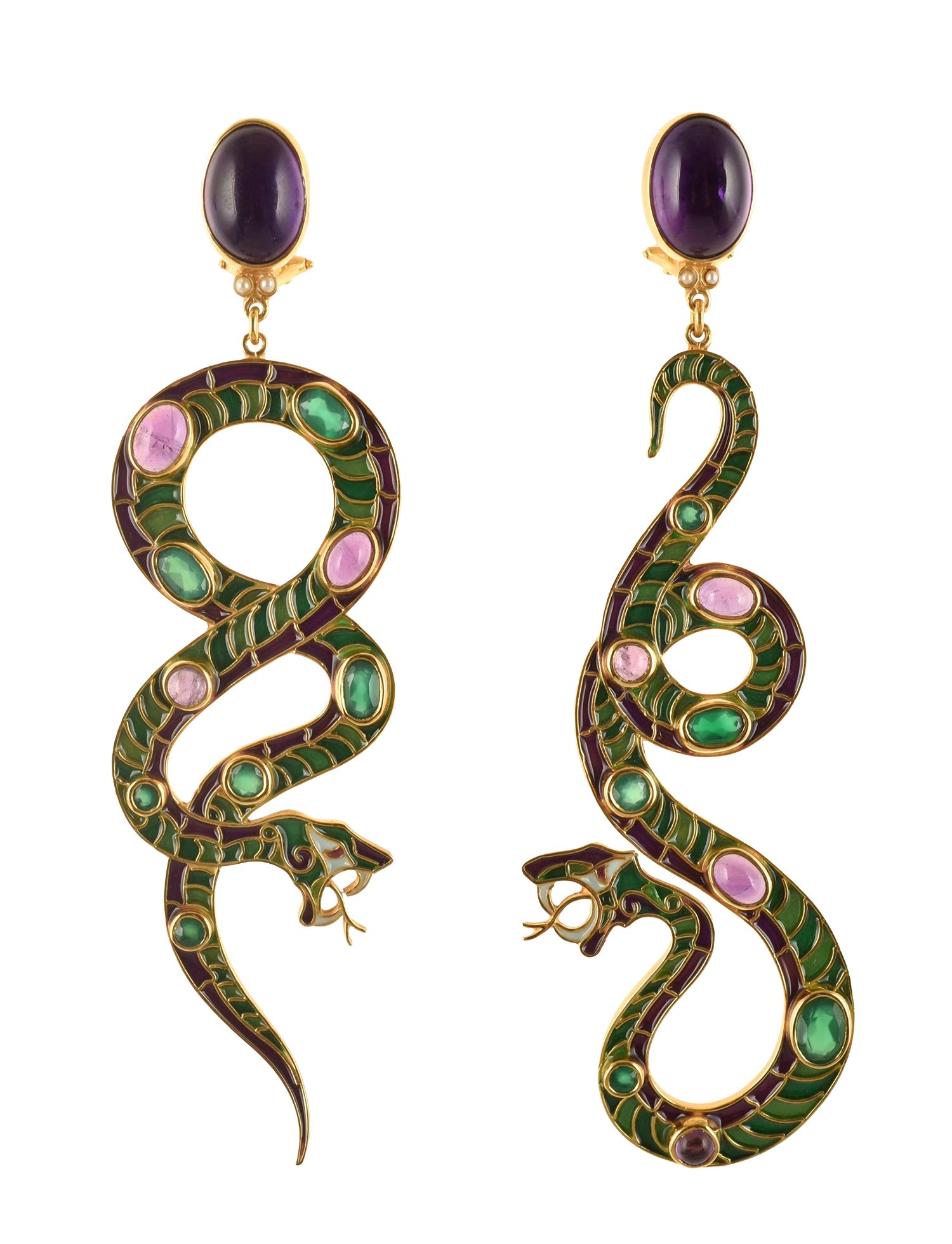 Made with enamel in cloisonné technique, with amethyst, green agate, natural micropearls.