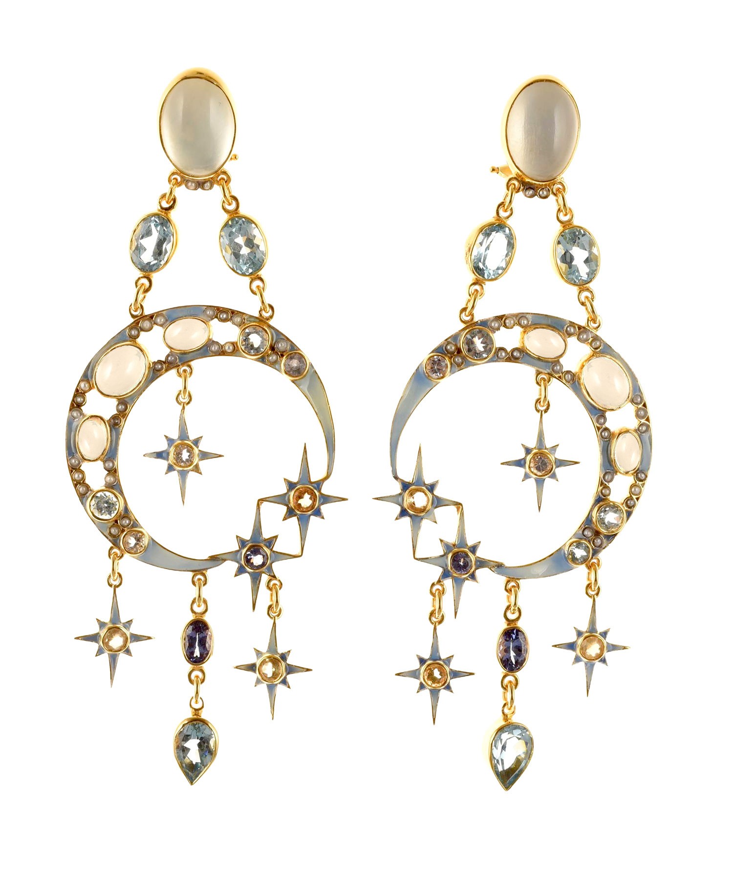 Made with enamel in cloisonné technique, with moonstone, blue topaz, tanzanite, citrine and micropearls.