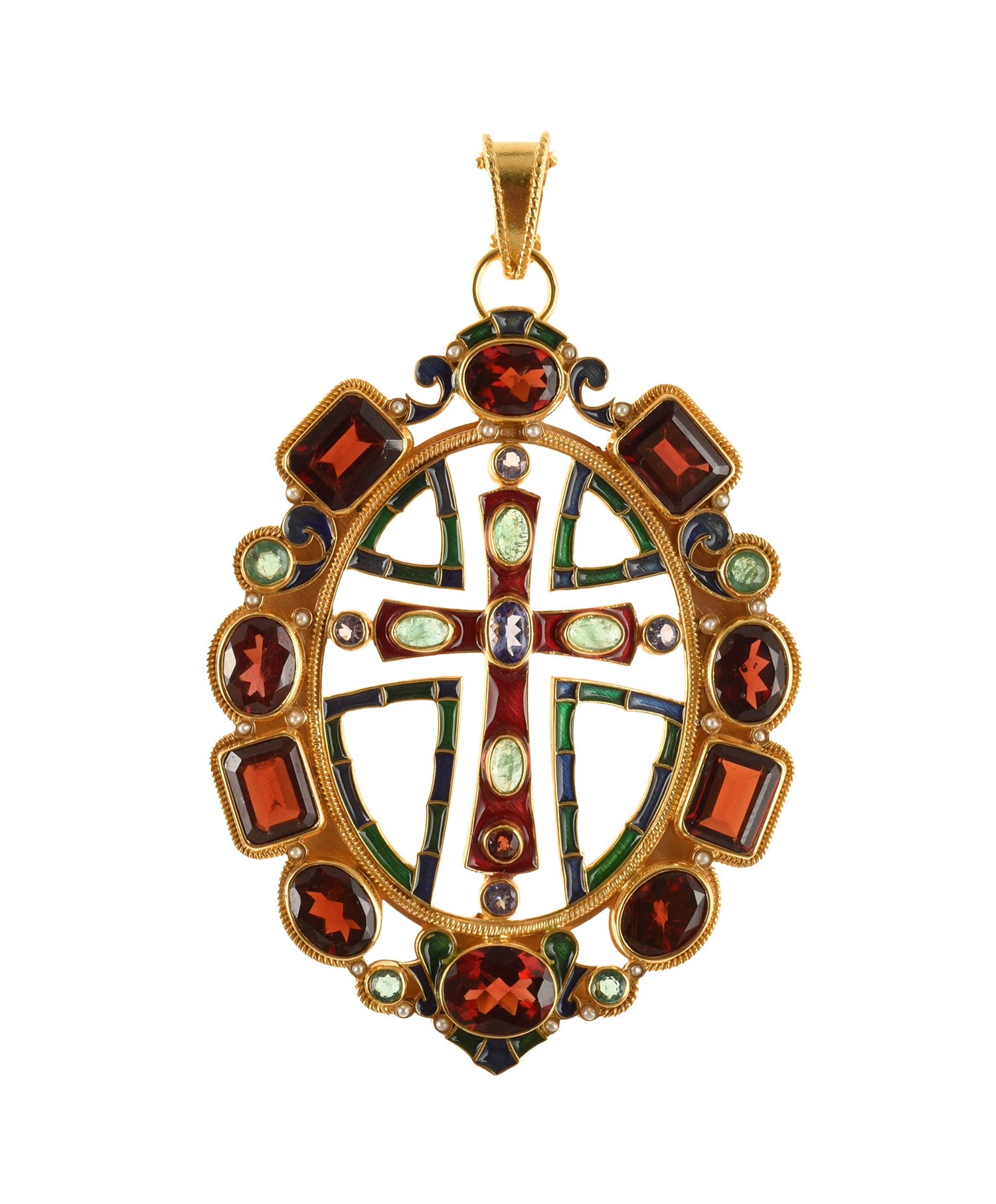 Made with enamel in cloisonné technique, with garnet, emerald, tanzanite, natural micropearls.