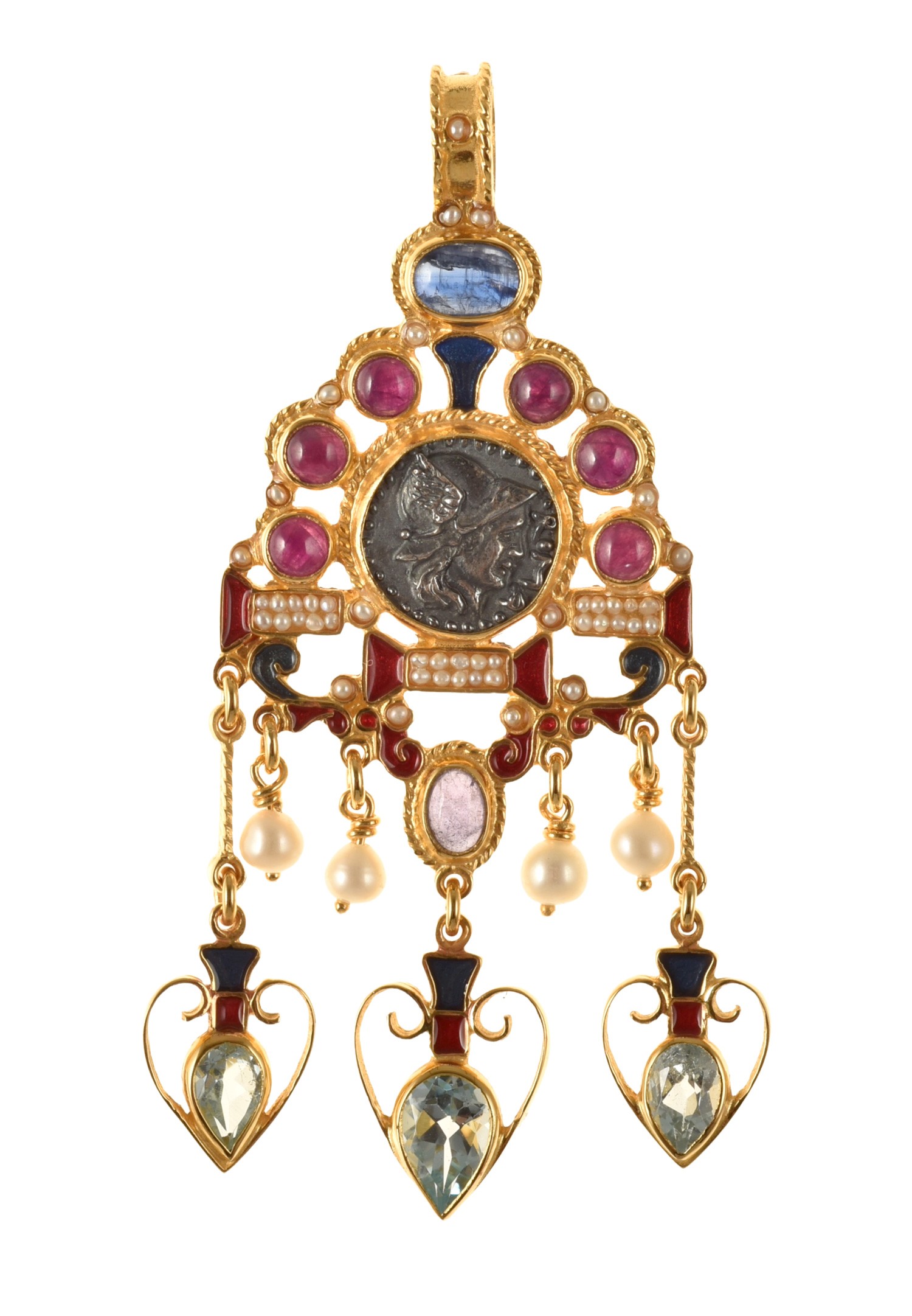 Made with enamel in cloisonné technique, with reproduction of ancient Roman coin representing the the God Hermes, messenger of the Gods, ruby, kyanite, tanzaite, blue topaz, pearls, micromosaic of natural seedpearls.