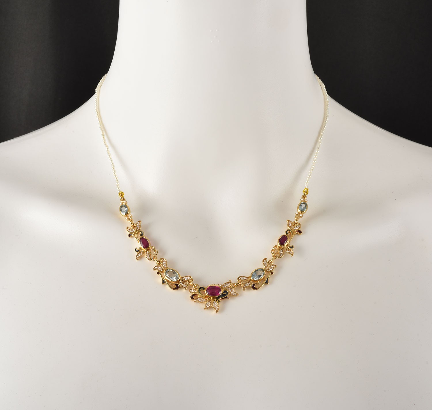 Made with enamel in cloisonné technique, with blue topaz, ruby, natural micropearls.