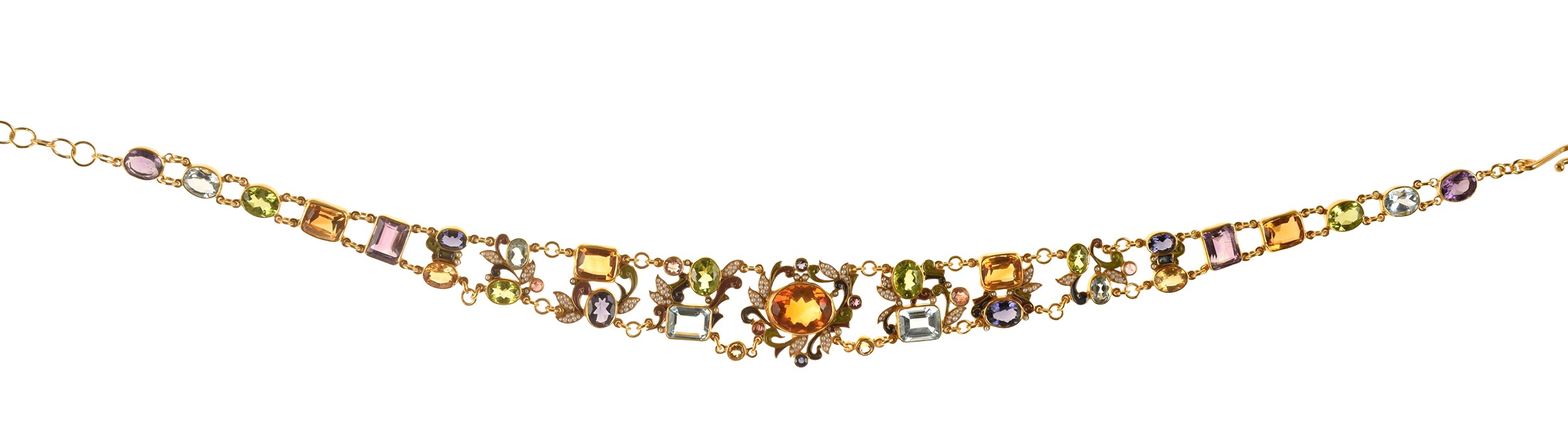 Made with enamel in cloisonné technique, with Palmeira and Maderira topaz, amethyst, peridot, blue toppaz, sapphire, iolite, citrine, tourmaline pearl and natural micropearls.