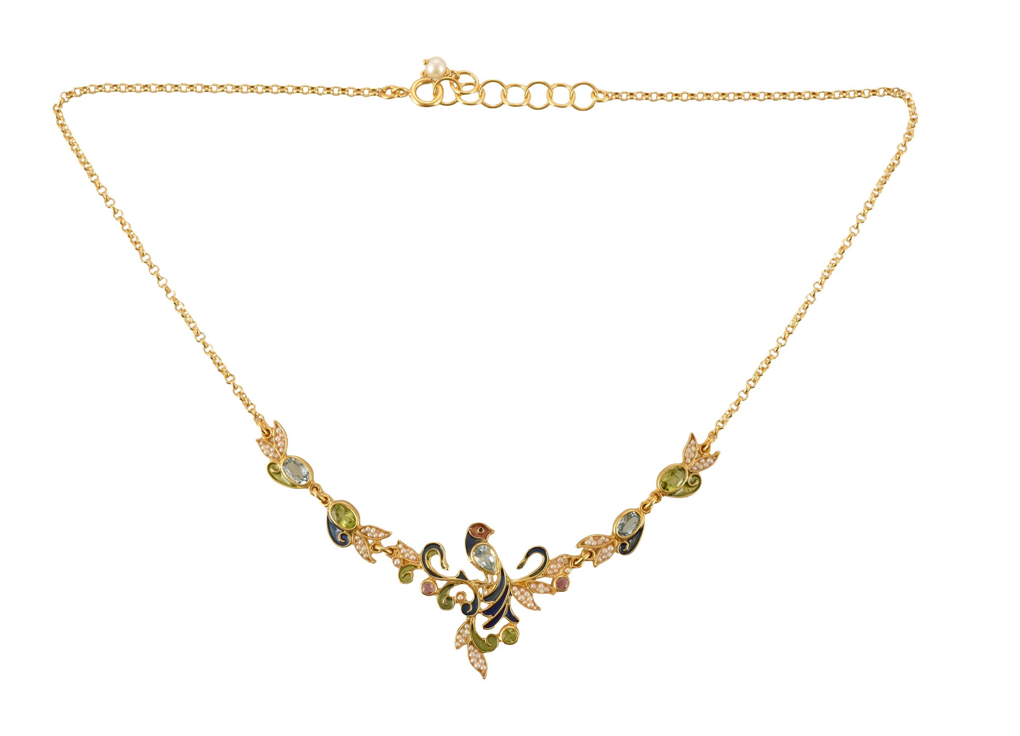 Made with enamel in cloisonné technique, with blue topaz, peridot, tourmaline, pearl, natural micropearls.