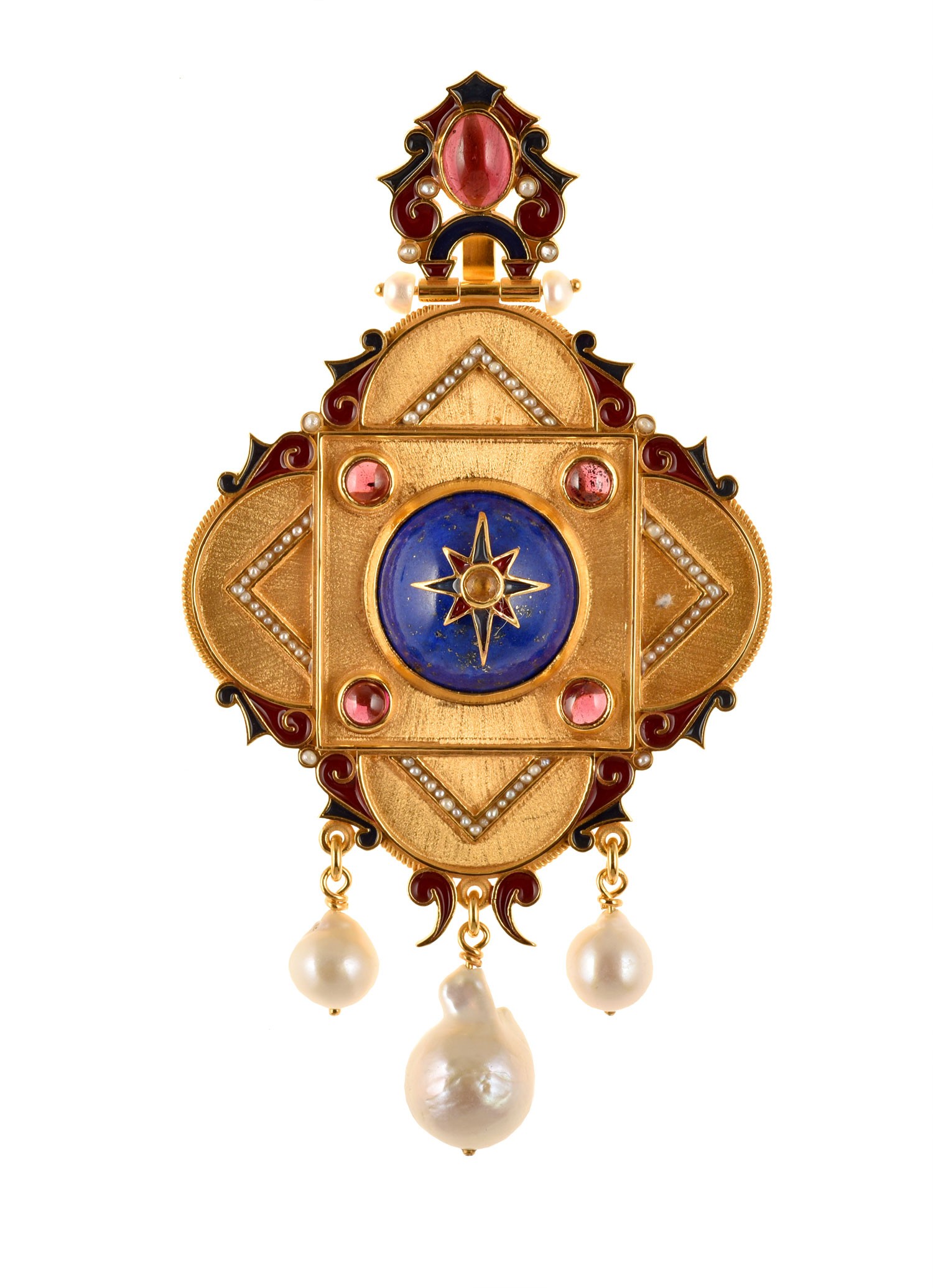 Made with enamel in cloisonné technique, with garnet, lapis lazuli, citrine, pearls, natural micropearls.