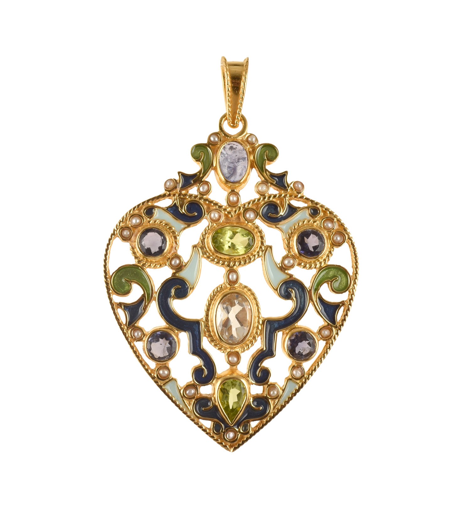 Made with enamel in cloisonné technique, with white topaz, tanzanite, peridot, iolite, natural micropearls.