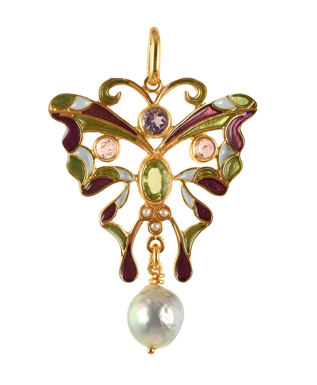 Made with enamel in cloisonné technique, with amethyst, peridot, tormaline, pearl, natural micropearls.