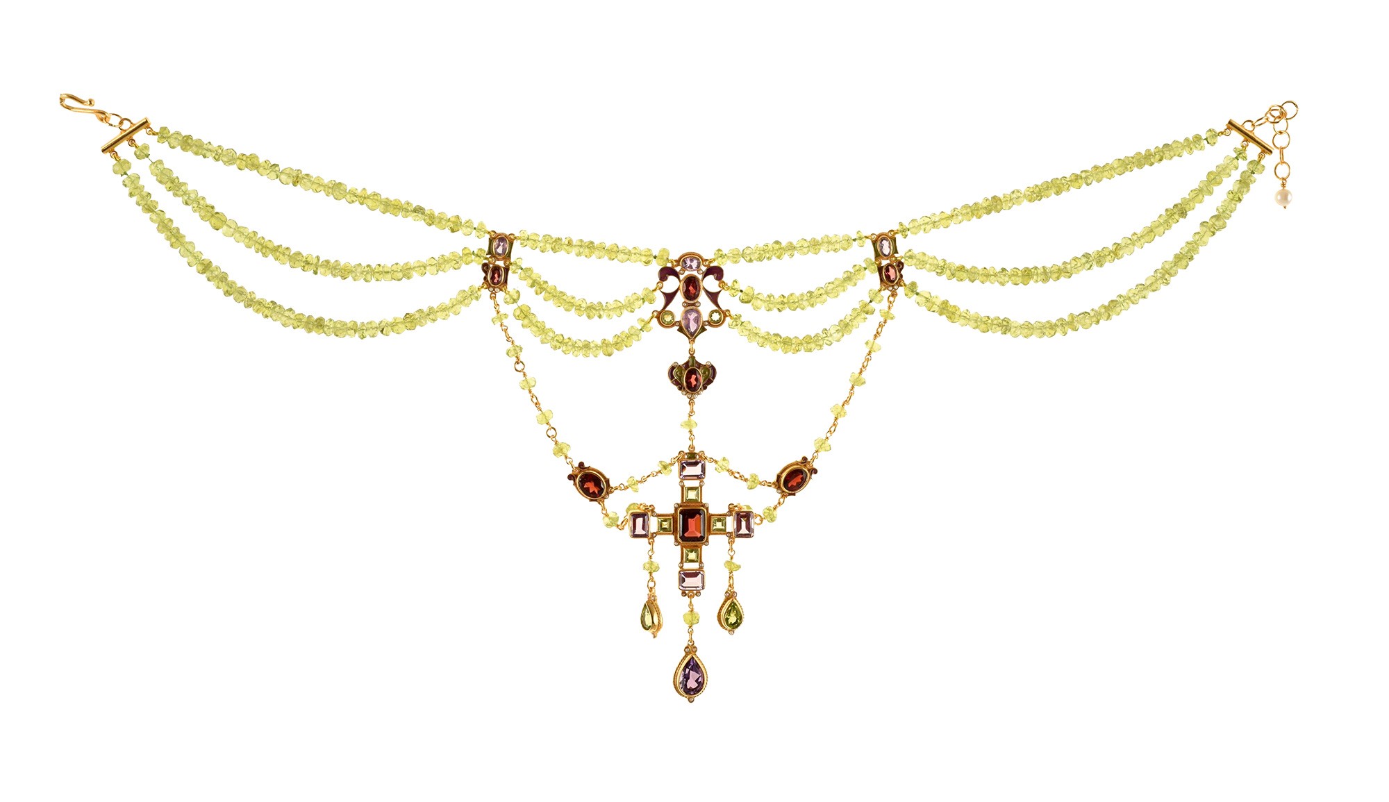 Realizzata con smalti in tecnica cloisonnè, con granati, ametiste, peridot, perla, microperle naturali.