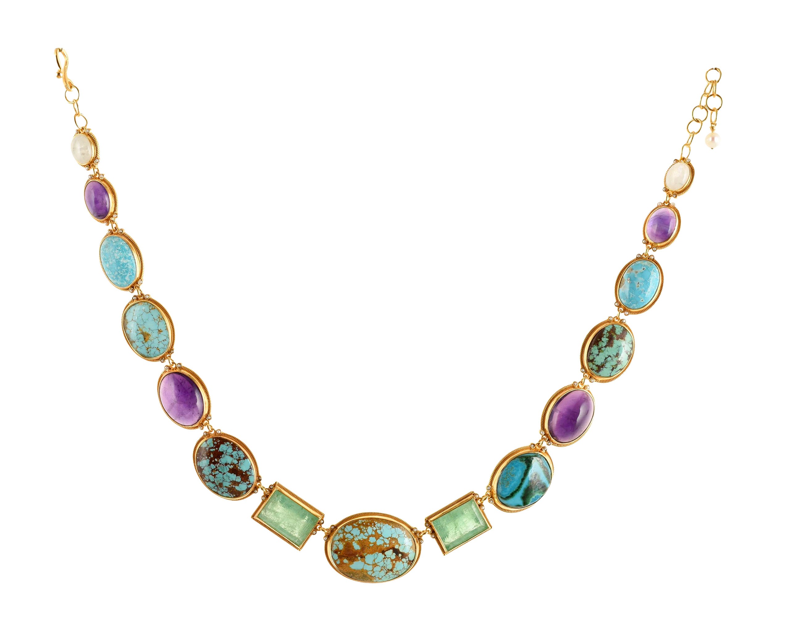 Realizzato con smalti in tecnica cloisonnè, con turchesi iraniani, smeraldi, ametiste, labradoriti, perla, microperle naturali.