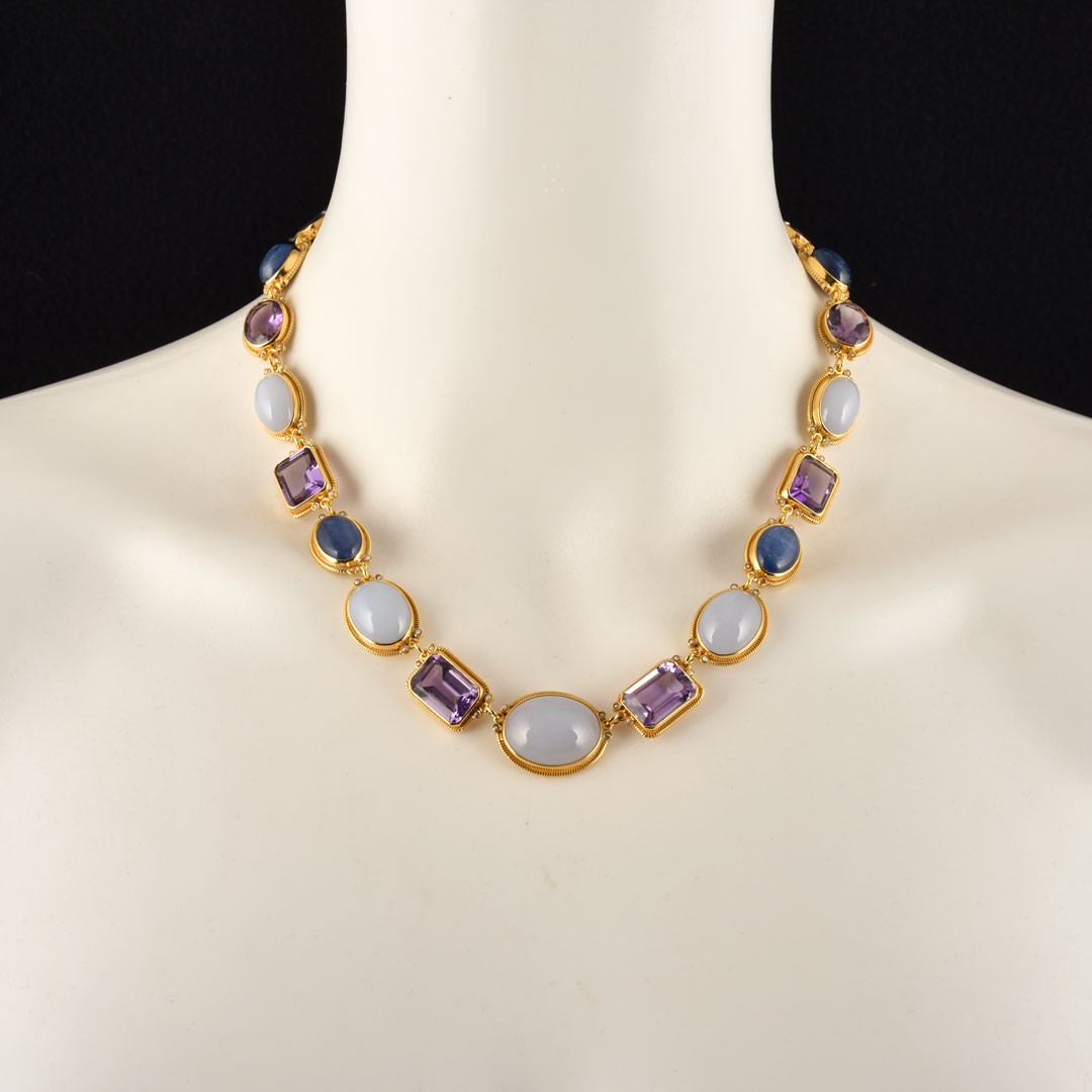 Realizzato con smalti in tecnica cloisonnè, con ametiste, calcedoni, cianiti, perla, microperle naturali.