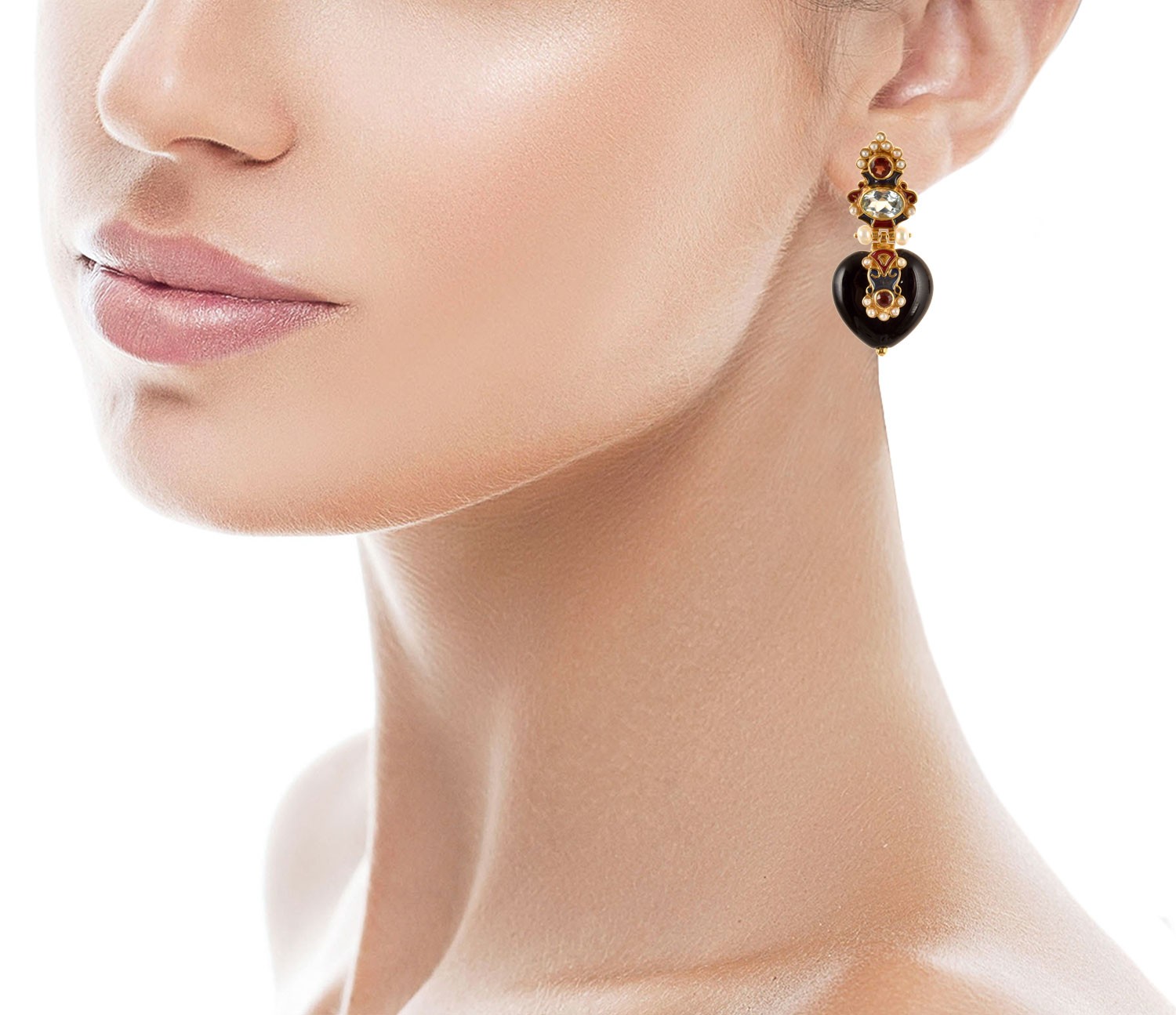 Realizzati con smalti in tecnica cloisonnè, con cuori in onice, topazi azzurri, granati, microperle naturali