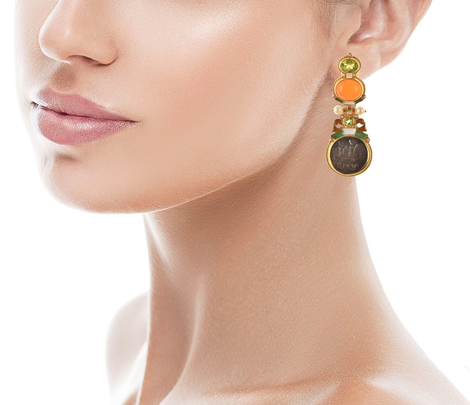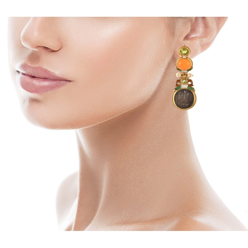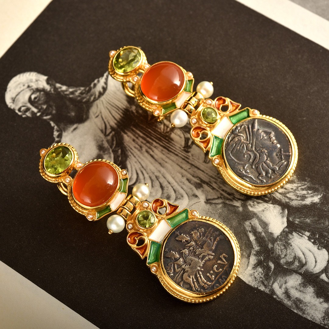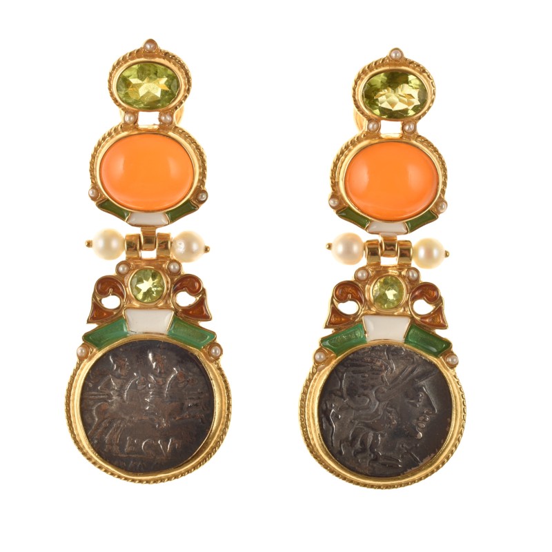 Realizzati con smalti in tecnica cloisonnè, con riproduzioni di antiche monete romane, corniole, peridot, perle e microperle naturali.