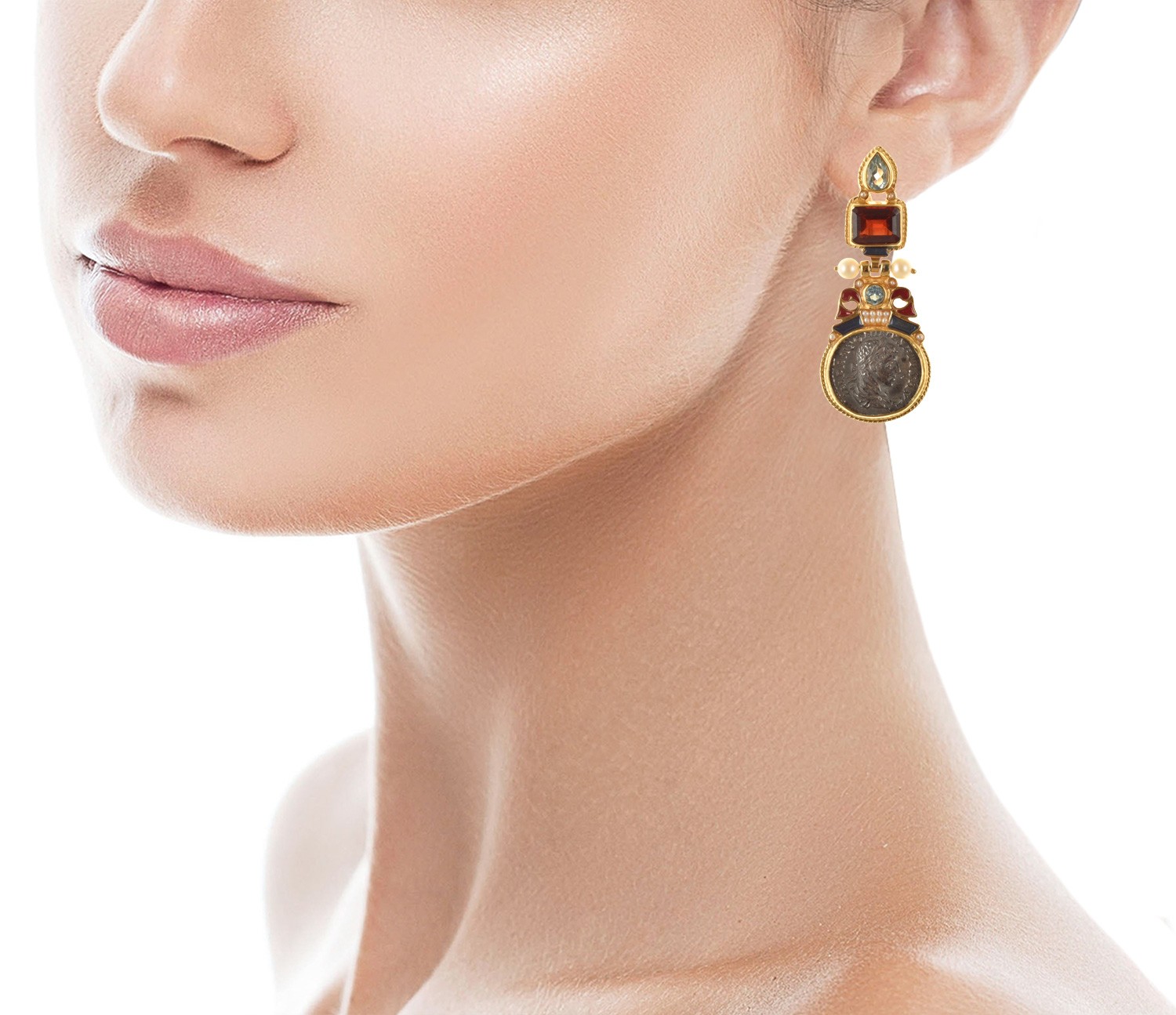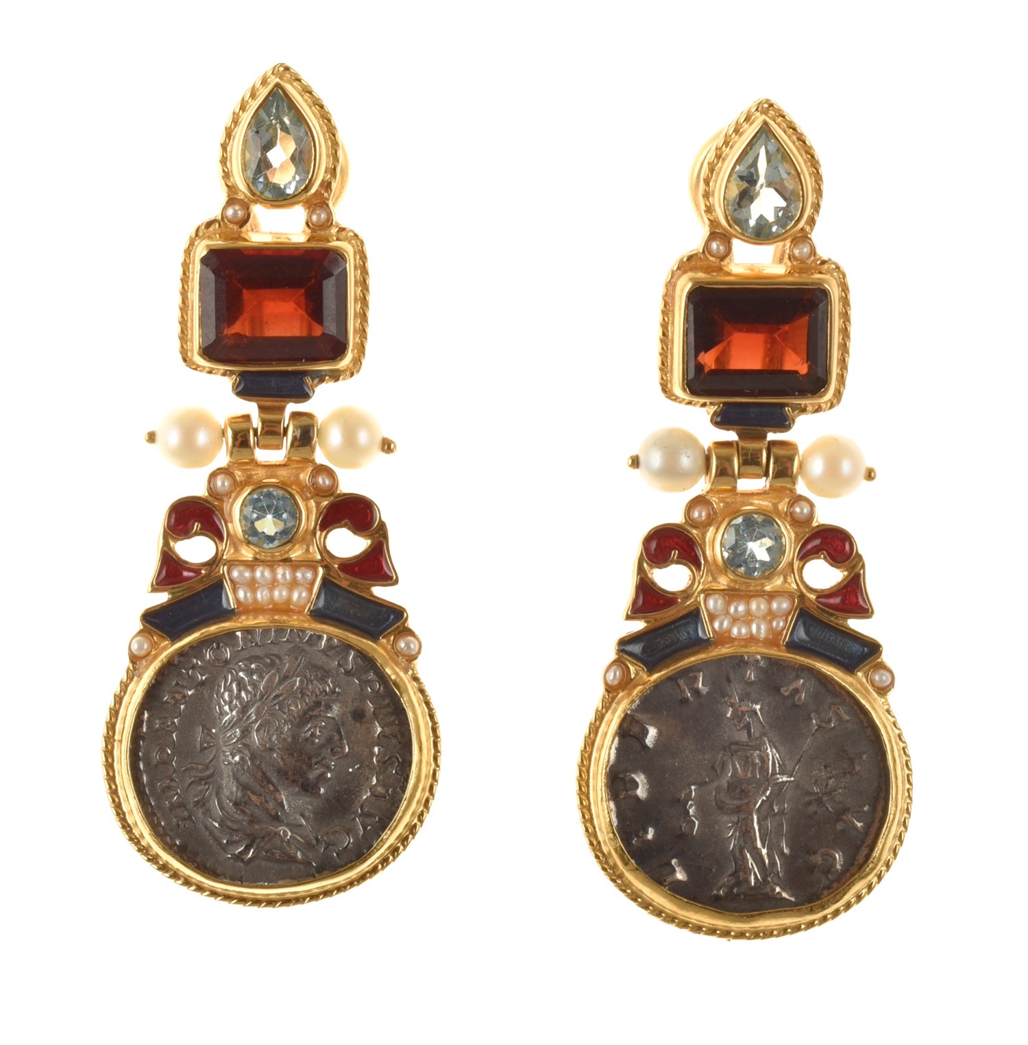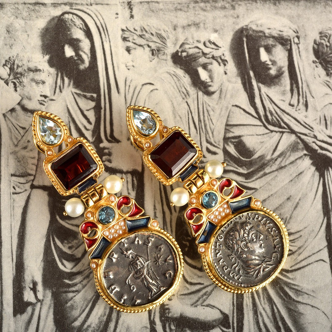 Realizzati con smalti in tecnica cloisonnè, con riproduzioni di antiche monete romane, granati, topazi azzurri, perle e microperle naturali.