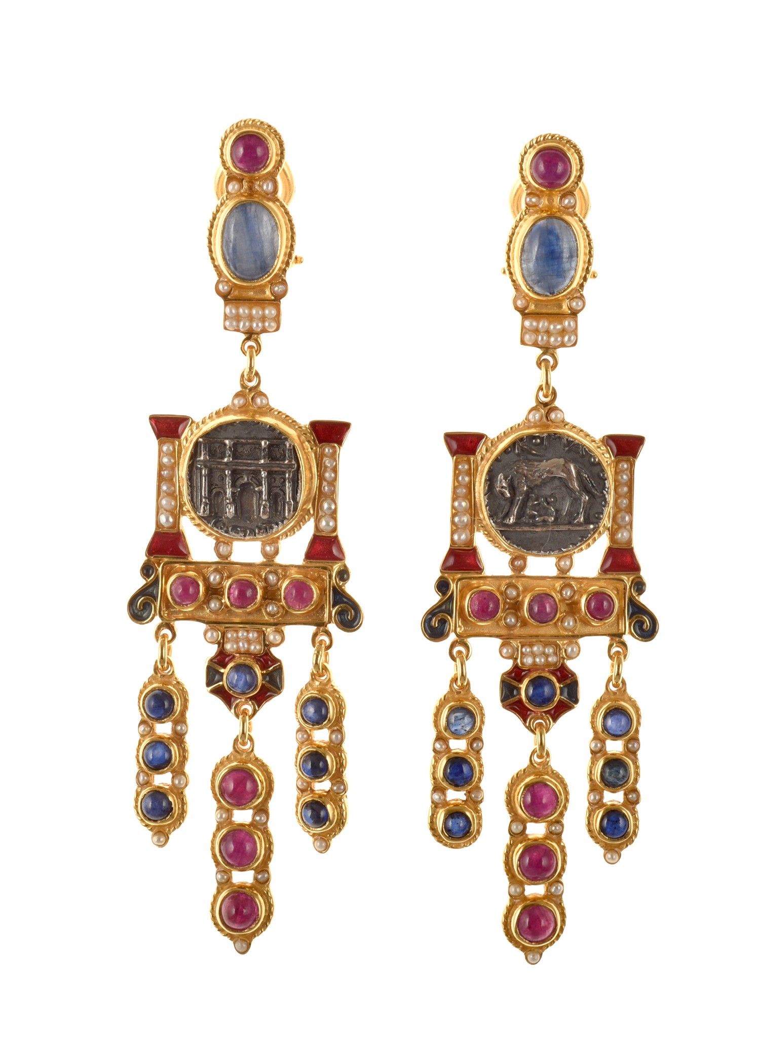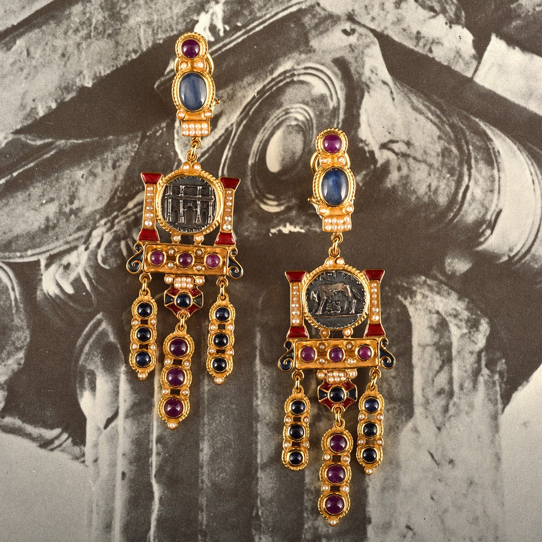 Realizzati con smalti in tecnica cloisonnè, con riproduzioni di antiche monete romane raffiguranti l'arco di Costantino e la lupa capitolina, cianiti, rubini, zaffiri e microperle naturali.