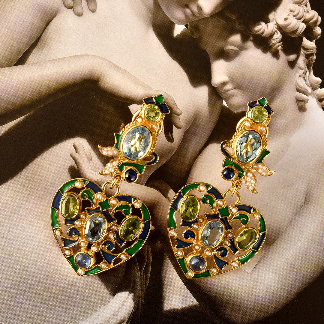 Realizzati con smalti in tecnica cloisonnè, con topazi azzurri, peridot, zaffiri, microperle naturali.