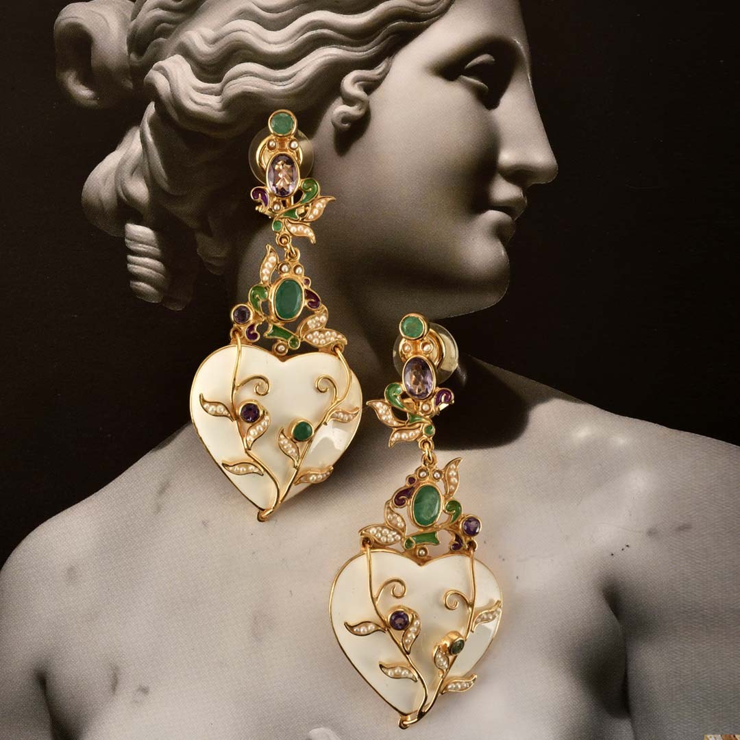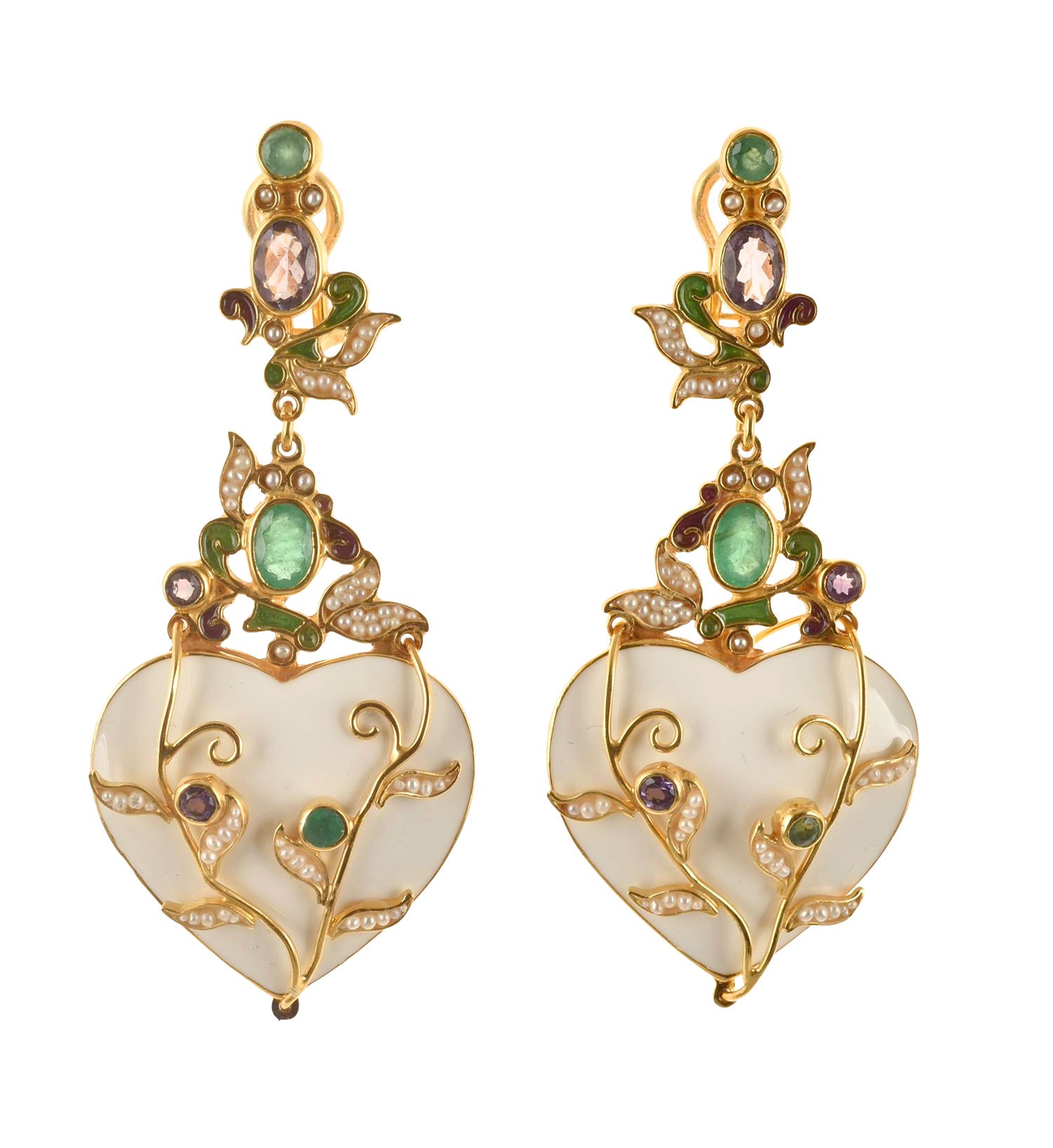 Realizzati con smalti in tecnica cloisonnè, con smeraldi, ametiste, microperle naturali.