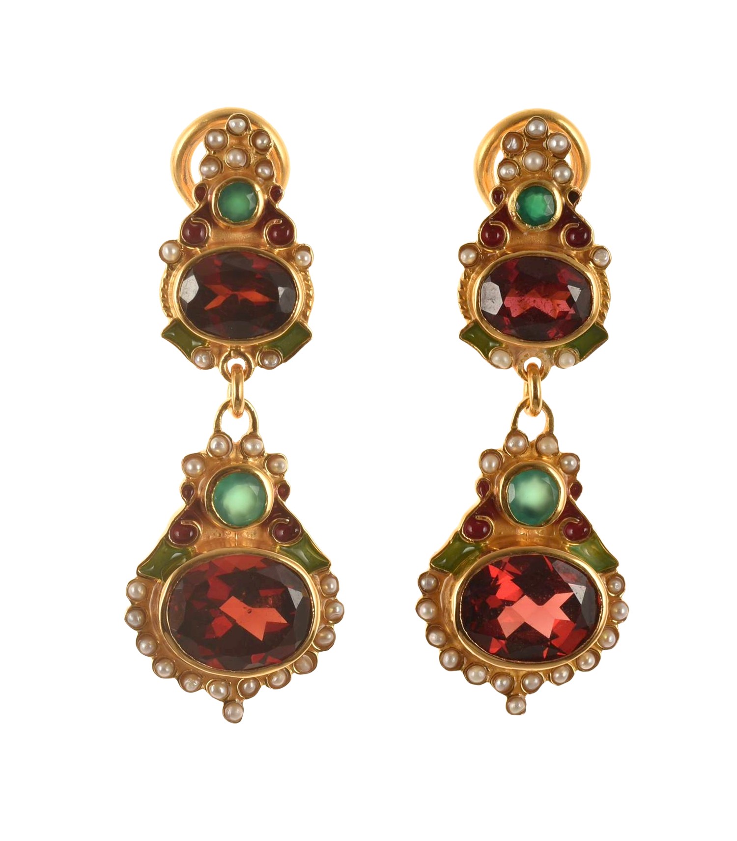 Realizzati con smalti in tecnica cloisonnè, con granati, agate verdi, microperle naturali.