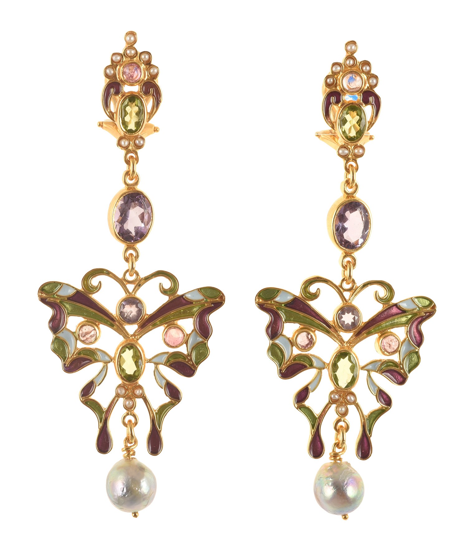 Realizzati con smalti in tecnica cloisonnè, con ametiste, peridot, tormaline, perle, microperle naturali.