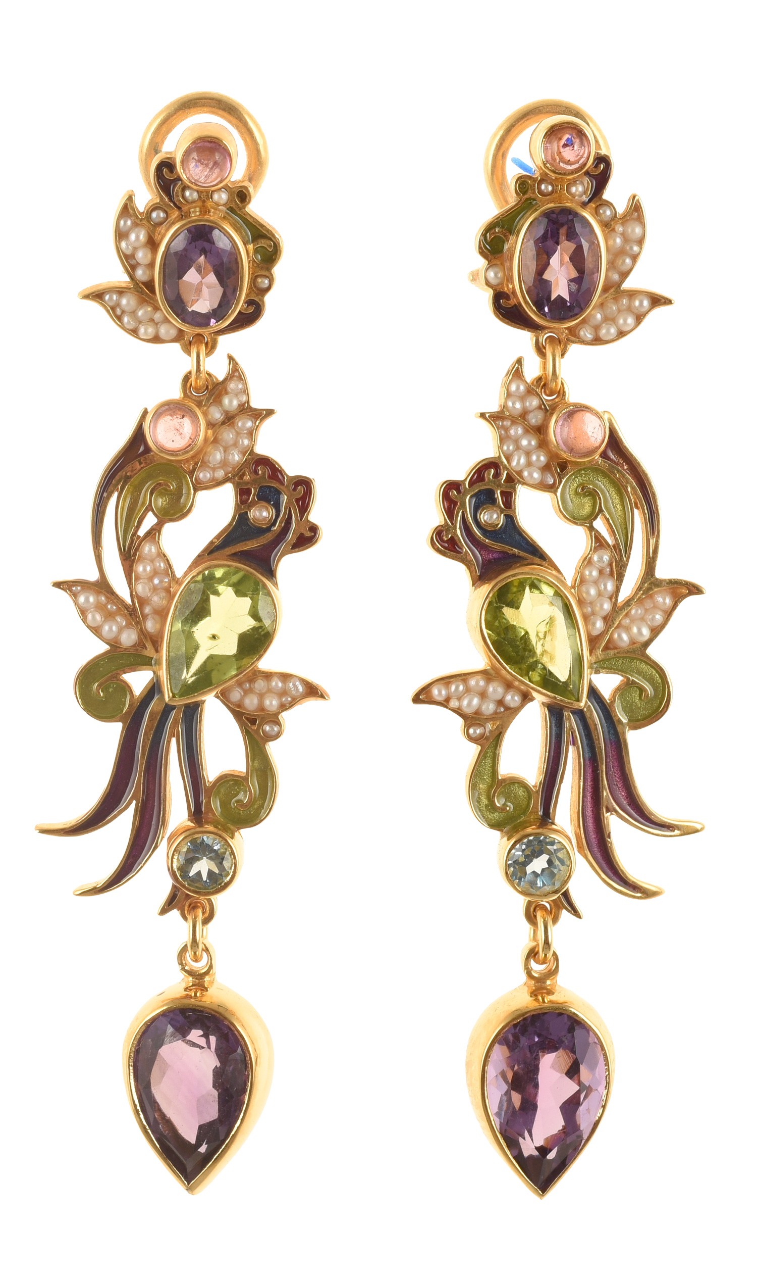 Realizzati con smalti in tecnica cloisonnè, con ametiste, topazi azzurri, tormaline, peridot, microperle naturali.