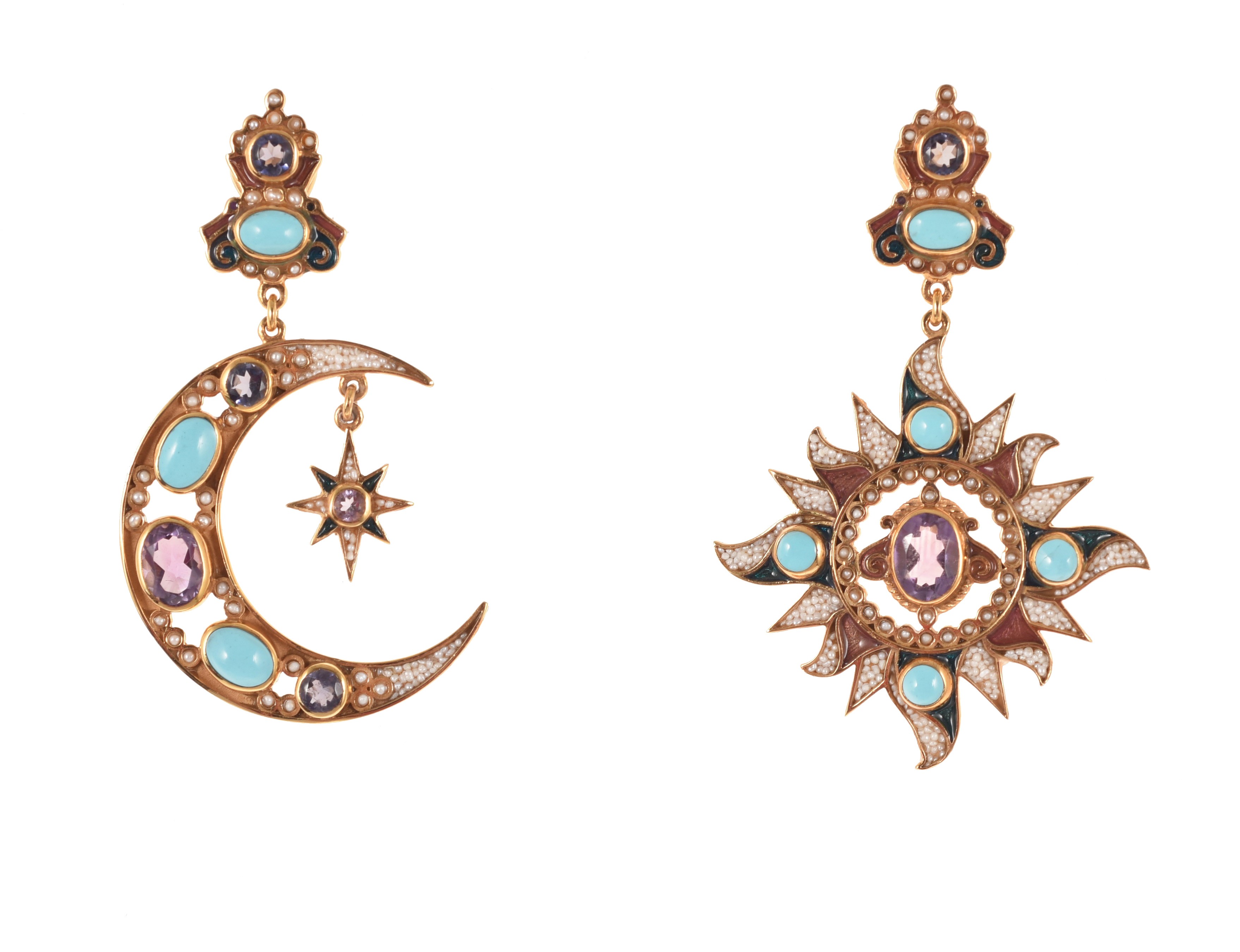 Realizzati con smalti in tecnica cloisonnè, con turchesi, ametiste, ioliti, microperle naturali.