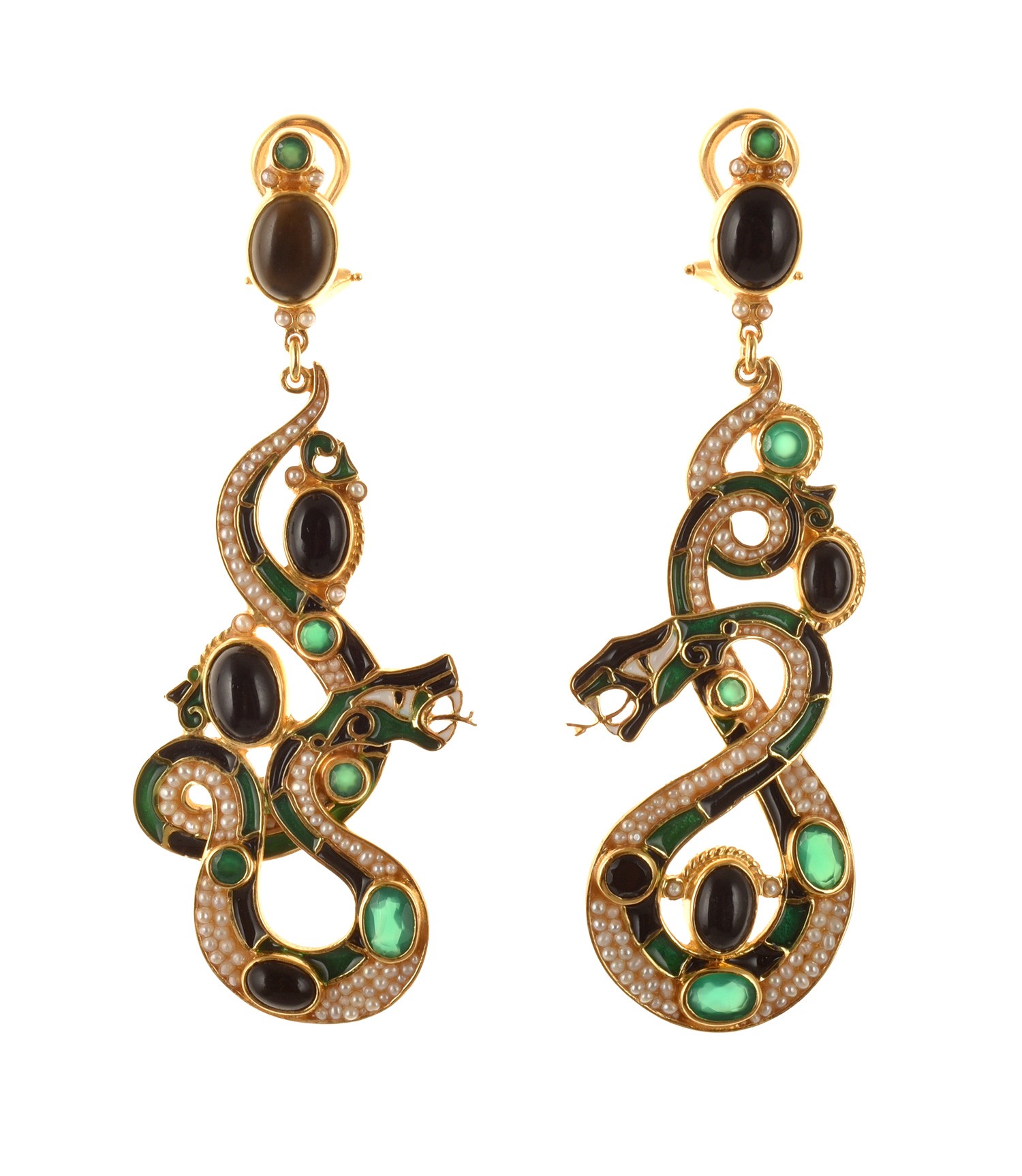 Realizzati con smalti in tecnica cloisonnè, con onici, agate verdi, microperle naturali.