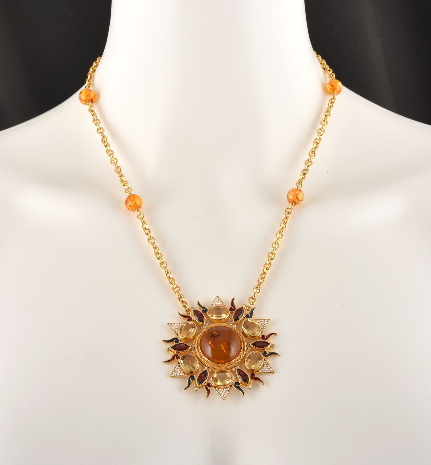 Realizzata con smalti in tecnica cloisonnè, con ambra, quarzi citrini, granati, micromosaico di perle e microperle.