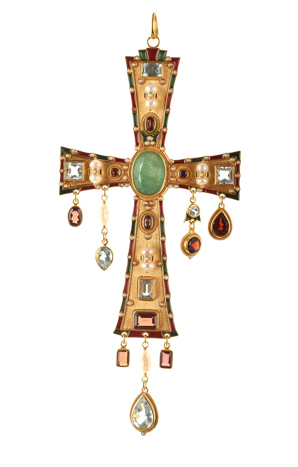 Realizzata con smalti in tecnica cloisonnè, con smeraldo, granati, topazi azzurri, perle, microperle naturali.