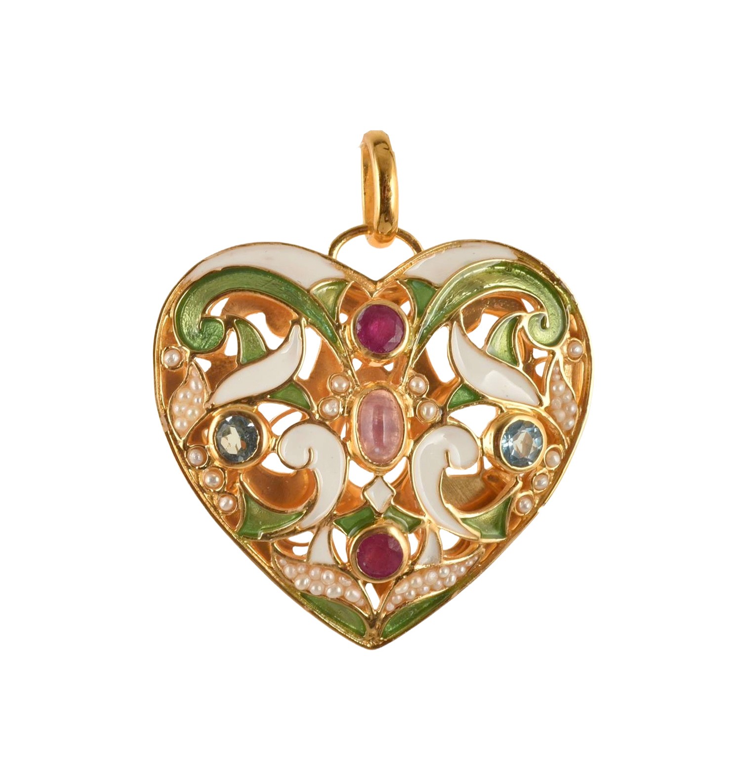 Realizzato con smalti in tecnica cloisonnè, con tormalina, rubini, topazi azzurri, microperle naturali.
