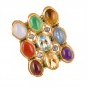 Realizzata con smalti in tecnica cloisonnè, con topazio azzurro, quarzo citrino, agata verde, calcedonio, corniola, granato, ametista, cianite, occhio di tigre, zaffiri, microperle naturali.